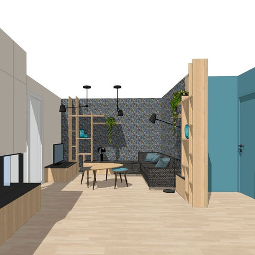 Salon: un séparatif type claustra bois sera installé face à la porte de la chambre, trop présente elle aussi dans la pièce de vie. Le salon gagne du linéaire et de la surface utilisable, se réapproprie la baie vitrée, sa zone est mieux définie.